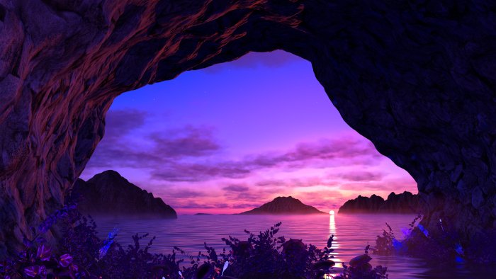 At the end of the day, the sun drops to the horizon, painting the sky in pinks and purples.